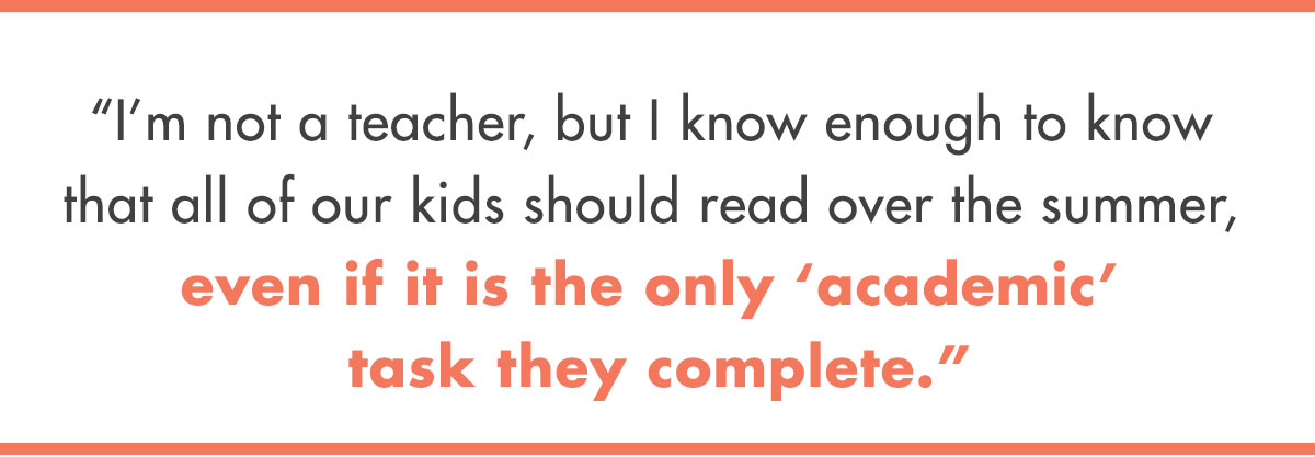 Now, I've never belonged to a book club. But from what I hear, most of the time book club is an excuse for women kick up their feet and read a novel, guilt-free. I've also heard drinking wine while discussing said book is important. So I decided to take that same concept and reach out to my fellow mothers. When asked if they would be interested in organizing a summer book club for our kids, they answered with a resounding, "YES! Just let me know what I need to do!"